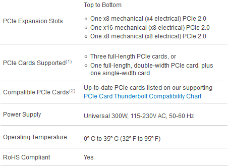 xMac Pro Server可以支持三块全长PCIe板卡,或一块双宽卡加一块单宽卡。PCIe1.1、PCIe2.0、PCIe3.0均可支持。xMac Pro Server最大限度的确保对各类“Thunderbolt-compatible”板卡的支持。