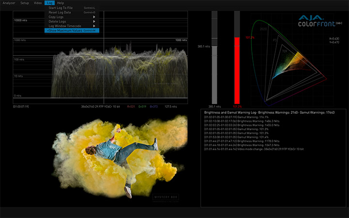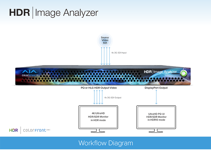 与Colorfront合作开发的AJA HDR Image Analyzer,支持从摄像机LOG格式到SDR (REC 709) PQ (ST 2084) 和 HLG大量的输入格式,提供BT.2020和传统的BT.709色彩饱和度支持。具备4x 3G-SDI 输入和输出以及DisplayPort端口的AJA硬件产品可提供完美的性能和出色的可靠性。