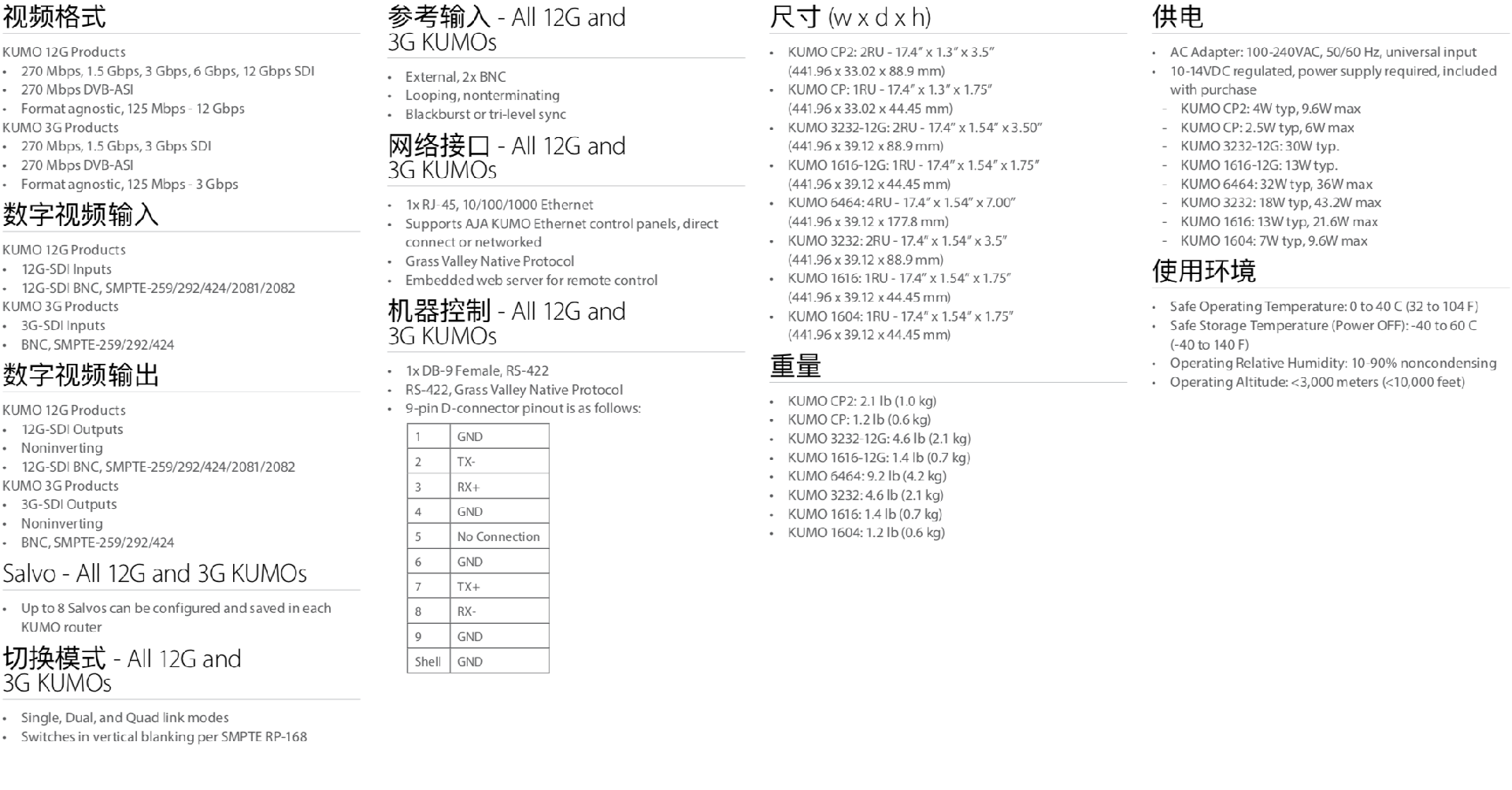 KUMO 3G-SDI提供16x4 16x16 32x32 和 64x64四种配置。KUMO系列产品具有高可靠性、高灵活性,信号质量好和高性价比等诸多优势。AJA所有产品都有严格的品控标准,KUMO也不例外。依托于AJA销售和技术支持网络,所有产品都可享受5年质保和替换服务。