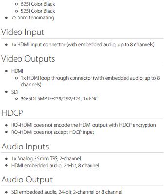 增长的需求,在不影响预算或空间的情况下将计算机信号正确整合到视频系统中。ROI-HDMI提供控制器用于管理嵌入和外部音频。免费的Mini-Config应用程序让您以交互方式从输入的HDMI信号中