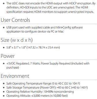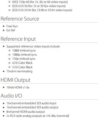 出、HDMI输出和2通道RCA式音频输出。UDC还有内置的帧同步器,并利用外部参考来给输出信号正确定时。UDC可由本地DIP开关控制,带有通过USB和AJA的微型配置