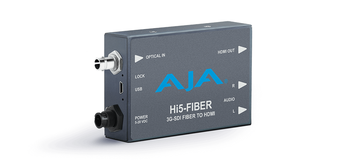 Hi5-Fiber在单模1310 nm光纤(ST式光纤接口)上将HD/SD-SDI转换为HDMI,用于HDMI监视器。HDMI输出中支持嵌入式8通道HD/SD-SDI音频,便于单电缆音频/视频连接。