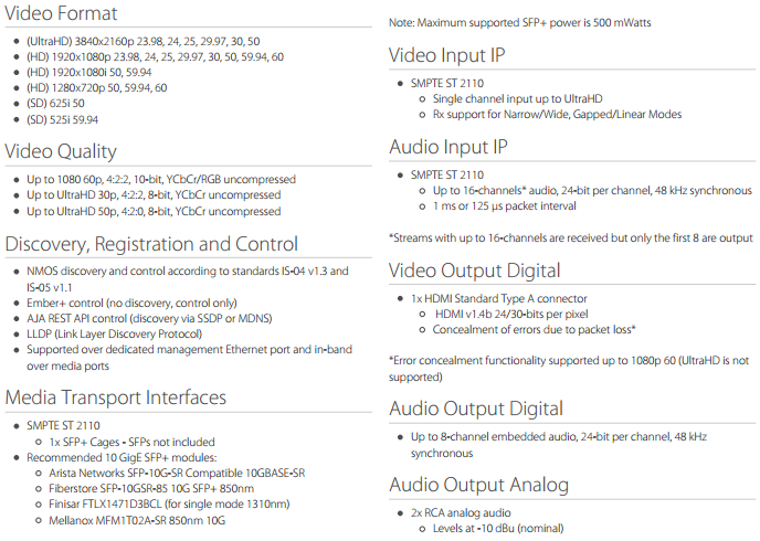 IPR-10G-HDMI从输⼊入的IP流中提取SMPTE ST 2110,并将其输出到 HDMI监看设备上。转换器器采⽤用⽆无⻛风扇式设计,外壳坚固,可适各种⼯工作 环境。