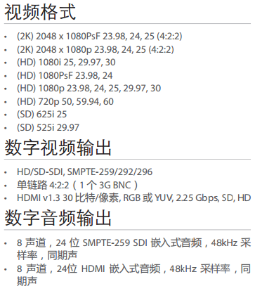 可用 3G-SDI 和 HDMI 输出,同时支持 3D HDMI 输出。SDI 输出可用于专业显示器或者记录装置的馈给,而 HDMI 输出可用于消费类 HDMI显示器的直接馈给。HDMI 和 SDI 可一直保持启用状态,使您可以同时使用专业级和消费级装置。3D 支持使得 T-TAP 无需借助额外硬件,可直接将实时立体回顾输入至 3D HDMI 显示器。
