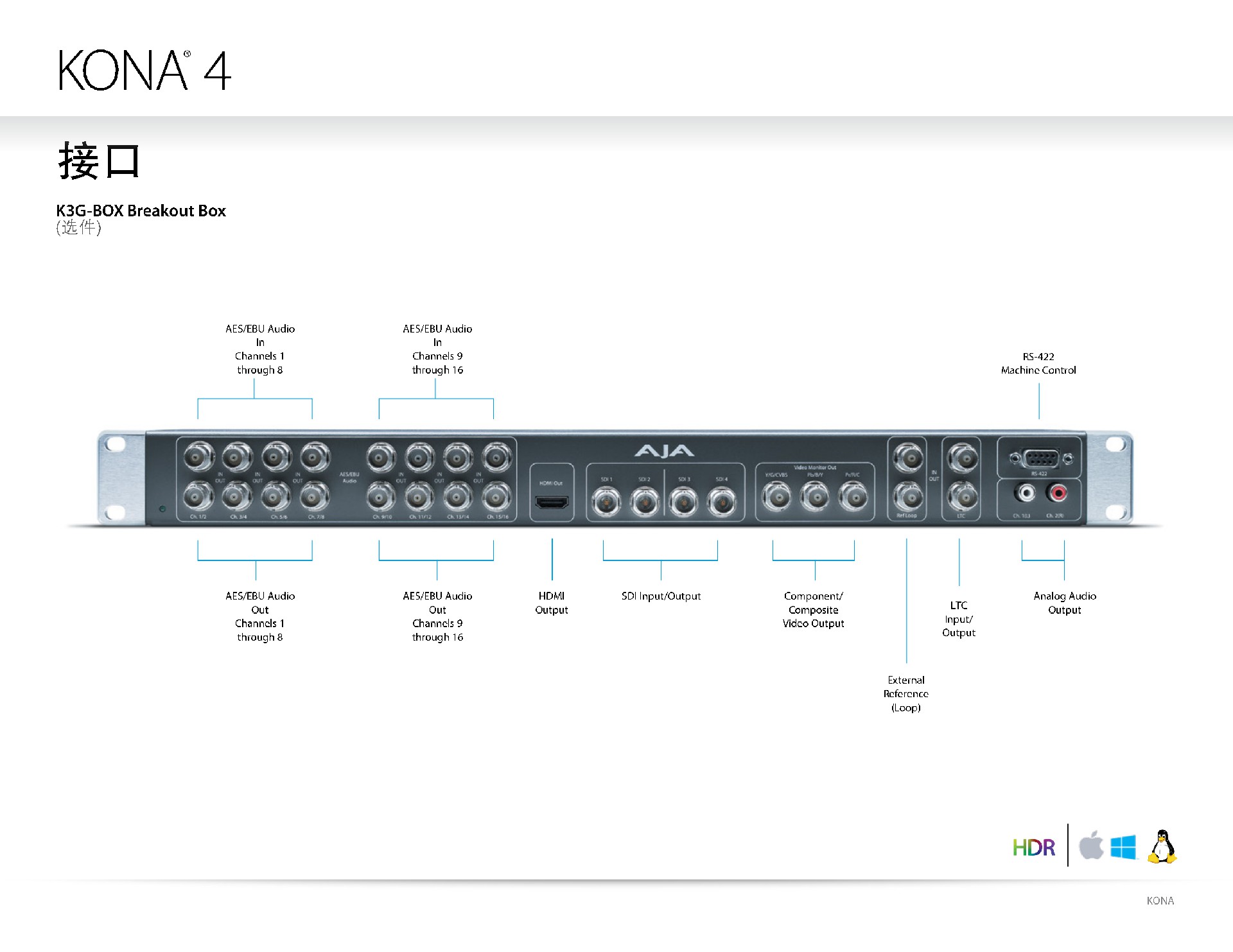 KONA 4双向3G-SDI接口,每个接口均可用于输入和输出。HDMI 1.4b监看输出,LTC I/O,同步锁相输入,RS-422控制,可配置的3x BNC SD/HD模拟视频输出和8-Channel AES音频I/O,这些允许KONA 4可以集成到广泛的工作流程之中。