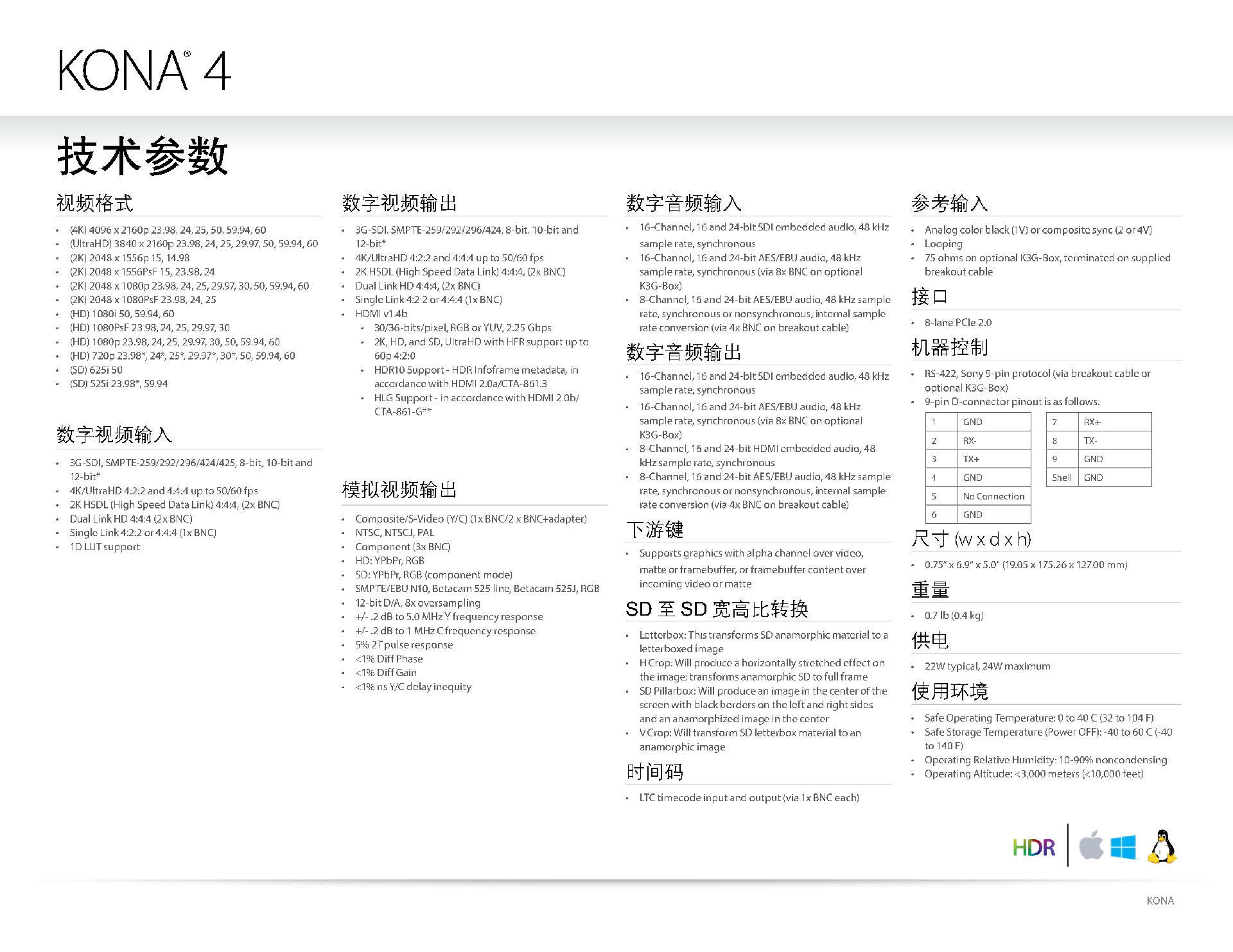 KONA 4为用户提供单个强大的8通道PCIe 2.0视频和音频桌面I/O卡,具有较好的功能,可处理从SD到HD、2K和4K,全10-bit 4:2:2和4:4:4色彩空间的所有视频,实现较好的图像清晰度。 KONA 4 支持广色域、HDR10、HLG和AJA Audio Mixer,以及HFR最高可达4K 60p。KONA 4是您当前和未来工作的理想选择。