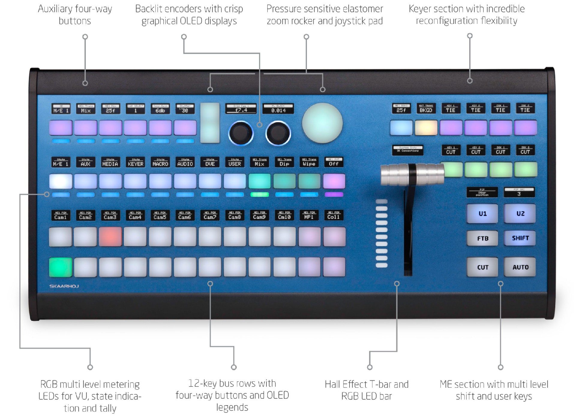 12-key bus rows with four-ways buttons and OLED legends