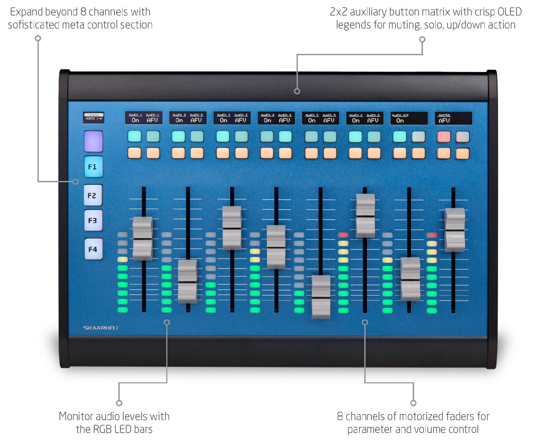 2x2 auxiliary button matrix with crisp OLED legends for muting solo up/down action