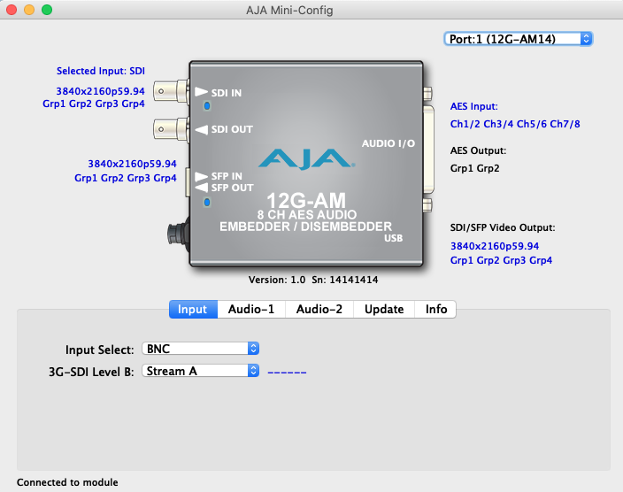 此外,全新 AJA Mini-Config v2.26.0 免费的软件升级新增了对 12G-AM 和所有光纤模块的支持,通过 USB 端口即可实现简便的控制和配置。