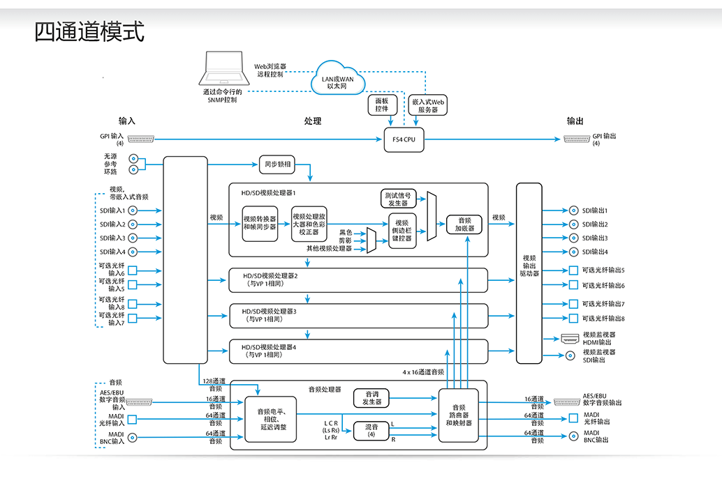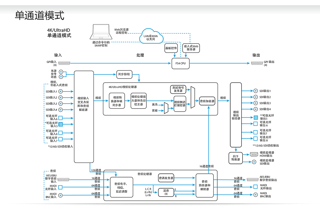 在单通道模式下,FS4可将您的HD或SD视频向上转换到4K/UltraHD或进行反向转换,其光纤、3G-SDI、AES和MADI上的大量音频通道可实现不可思议的272 x 208音频可能性矩阵。