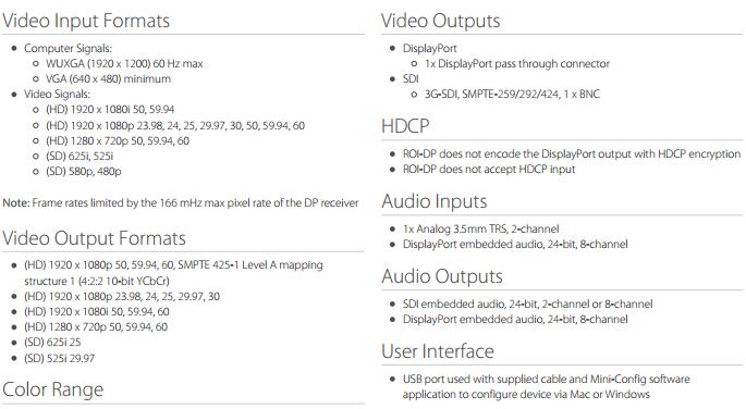 断增长的需求,在不影响预算或空间的情况下将计算机信号正确整合到视频领域。ROI-DP提供控制器用于管理嵌入和外部音频。免费的Mini-Config应用程序让您以交互方式从输入的DisplayPort信号中选择关注区,并控制如何使用AJA的高质量缩放算法