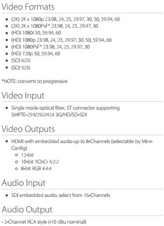 Hi5-Fiber在单模1310 nm光纤(ST式光纤接口)上将HD/SD-SDI转换为HDMI,用于HDMI监视器。HDMI输出中支持嵌入式8通道HD/SD-SDI音频,便于单电缆音频/视频连接。