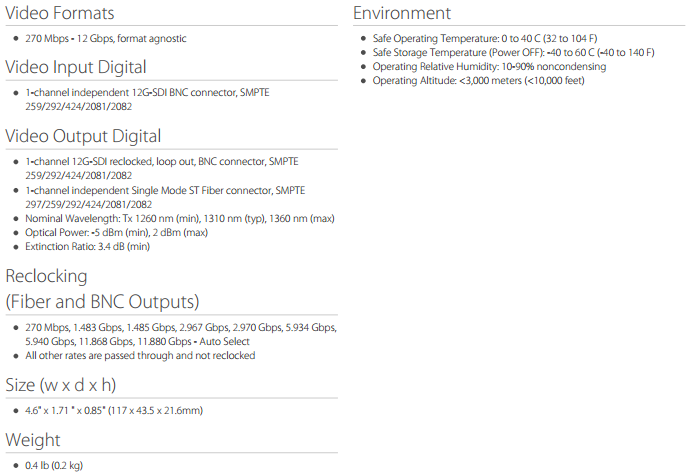 FiDO-T-12G-ST 是一款带 12G-SDI 环出的单通道 12G-SDI 转 单模 ST Fiber 发射器。FiDO-T-12G-ST 和 FiDO-R-12G-ST 可支持 12G-SDI 和 ST Fiber 之间的单通道转换。