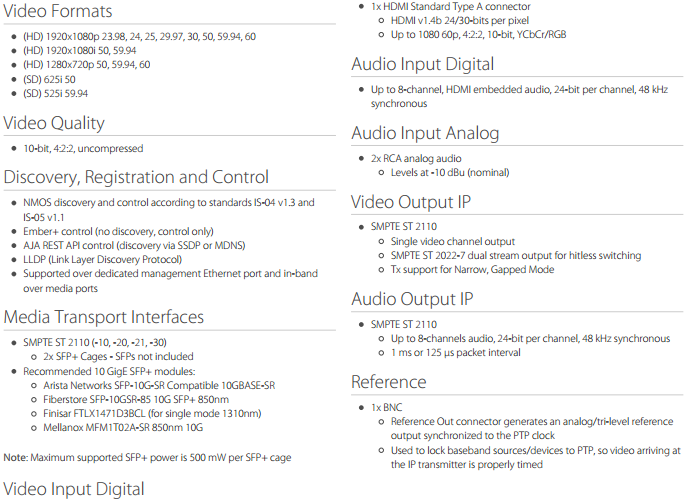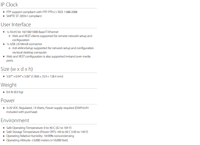 该款迷你转换器是传统基带信号与SMPTE ST 2110 之间的桥梁,适用于信号接收与发送的应用,包括工作室、转播车、新闻编辑室、企业媒体、体育馆、演唱会和其他现场活动及专业影音环境。IPT-10G2-HDMI 支持无压缩 HD 视频和音频的转换和传输,可以与先前发布的 IPR-10G2-HDMI 接收器一起配合使用。此款产品发布后,AJA 现在可以提供一系列 HDMI 和 SDI 的 IP 迷你转换器,用以支持SMPTE ST 2110 工作流程。该转换器与 Desktop Software v15.2完全兼容。
