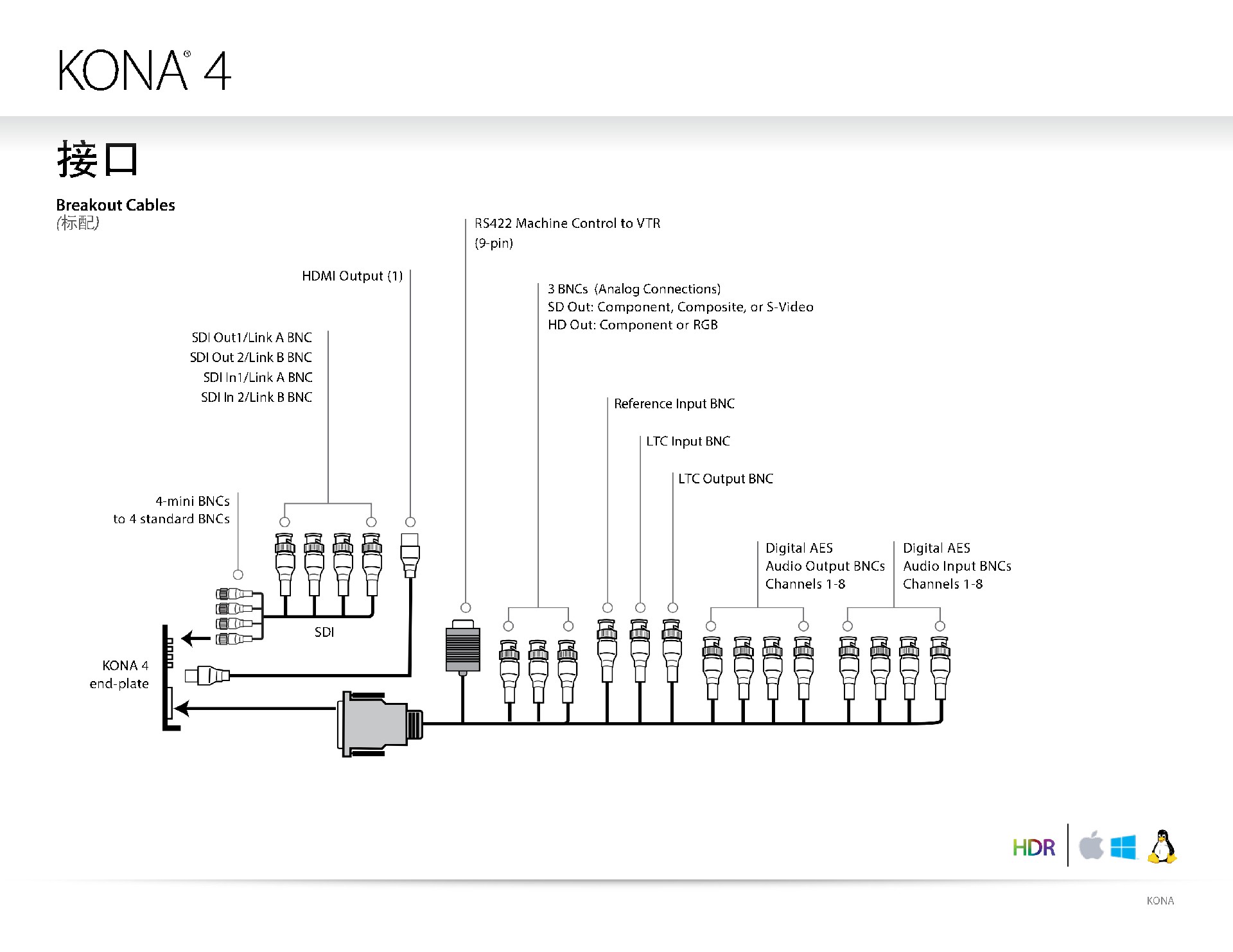 KONA 4双向3G-SDI接口,每个接口均可用于输入和输出。HDMI 1.4b监看输出,LTC I/O,同步锁相输入,RS-422控制,可配置的3x BNC SD/HD模拟视频输出和8-Channel AES音频I/O,这些允许KONA 4可以集成到广泛的工作流程之中。